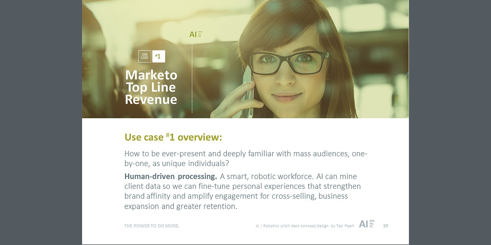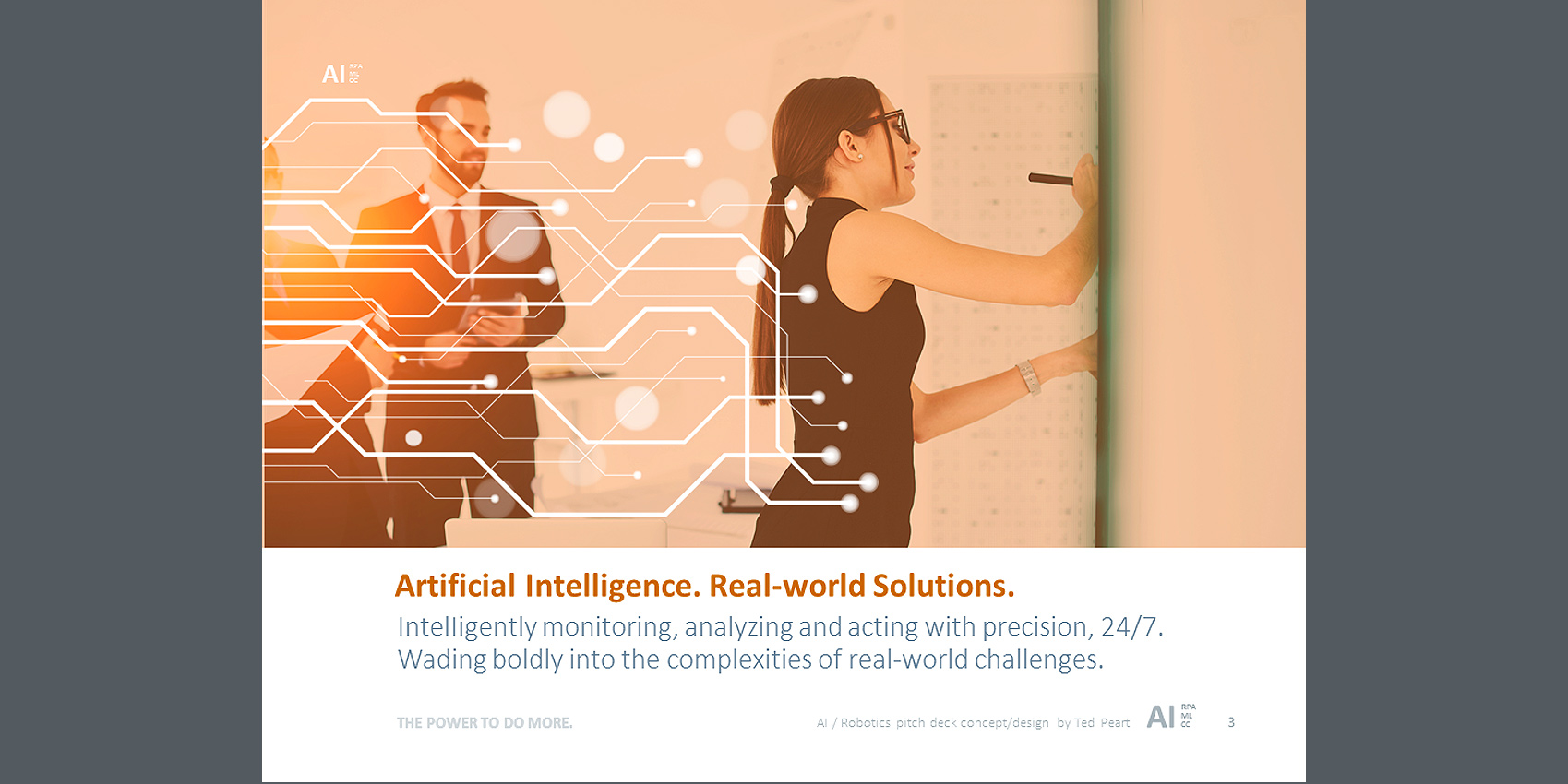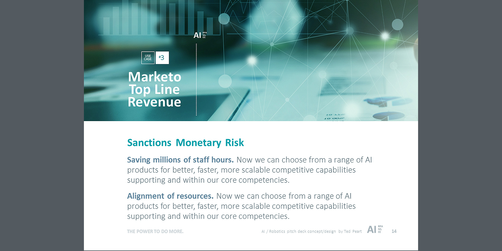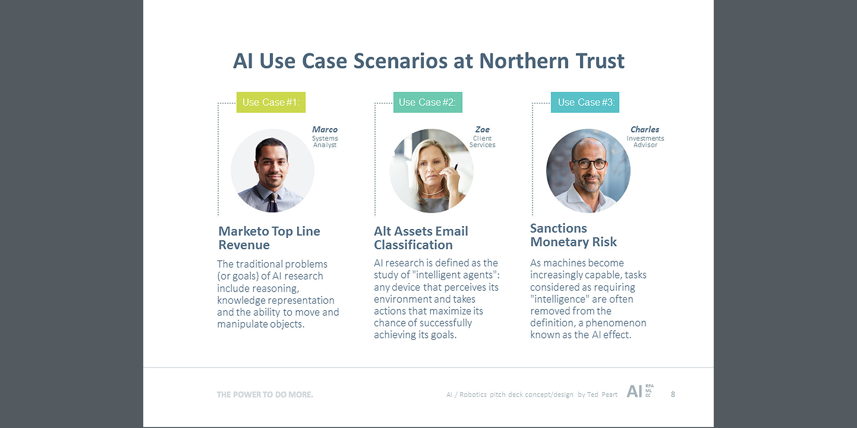 Here's an example of a powerful pitch-deck, designed to promote the adoption of Artificial Intelligence and Machine Automation at Northern Trust. This presentation was targeted to the top executive management team. My assignment was to visually project advanced, dynamic and smarter business operations for the future. Going beyond theme imagery, colors and fonts, a distinctive AI Brand stamp was created to solidify the strategic concepts into a powerful whole that was greater.