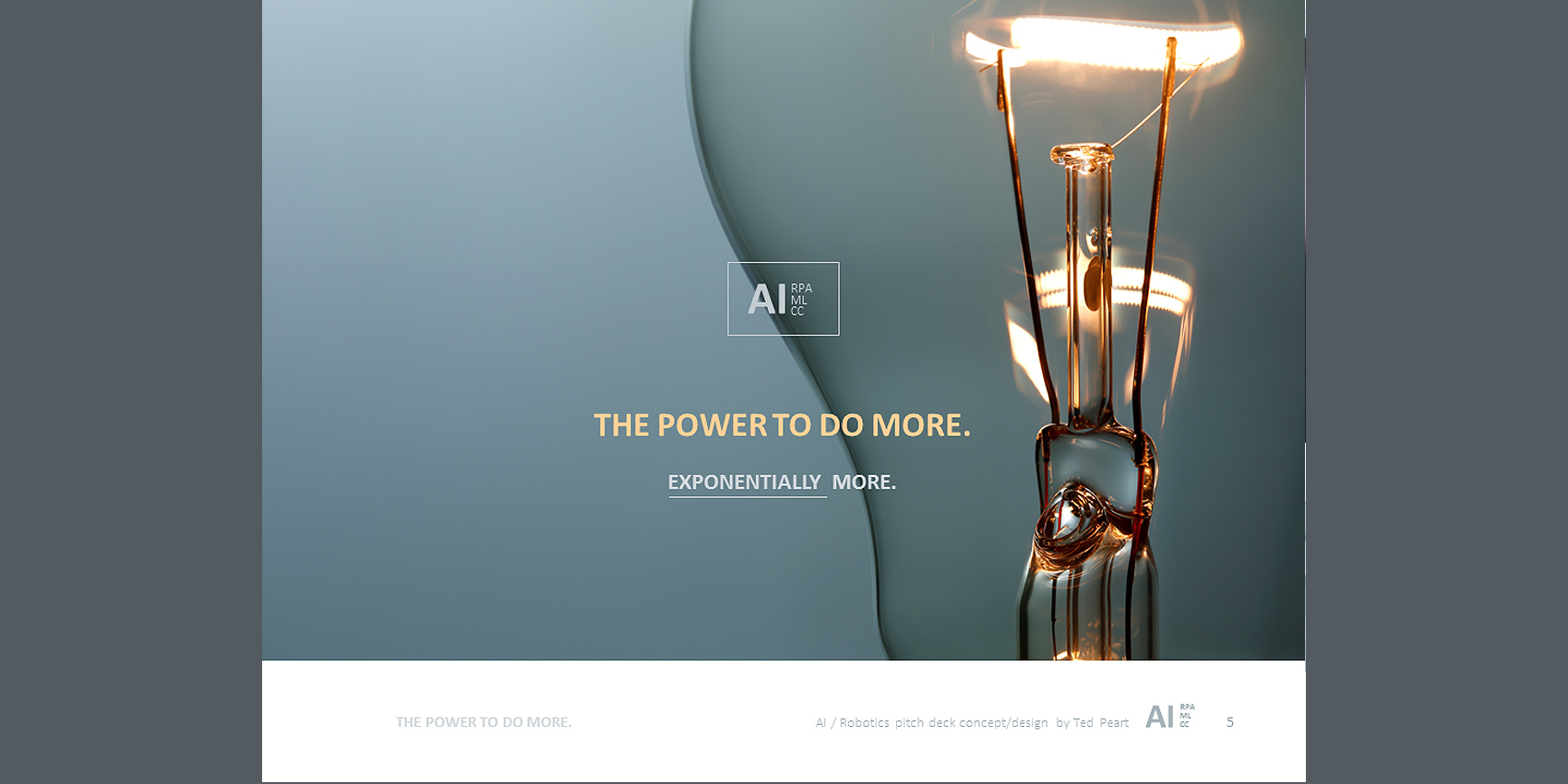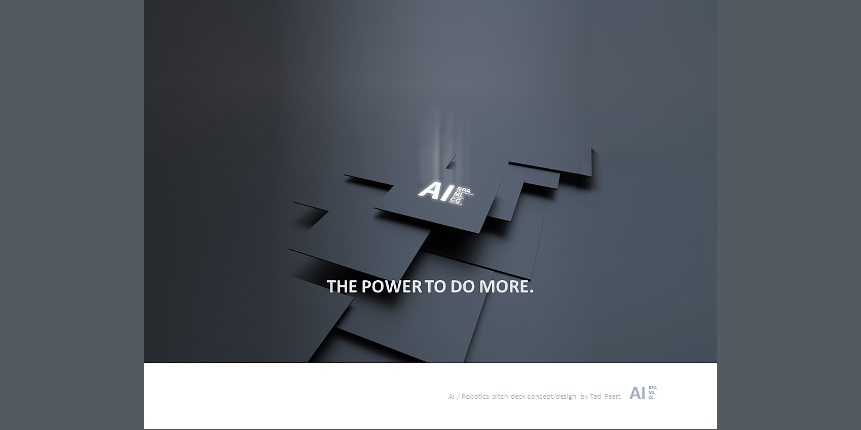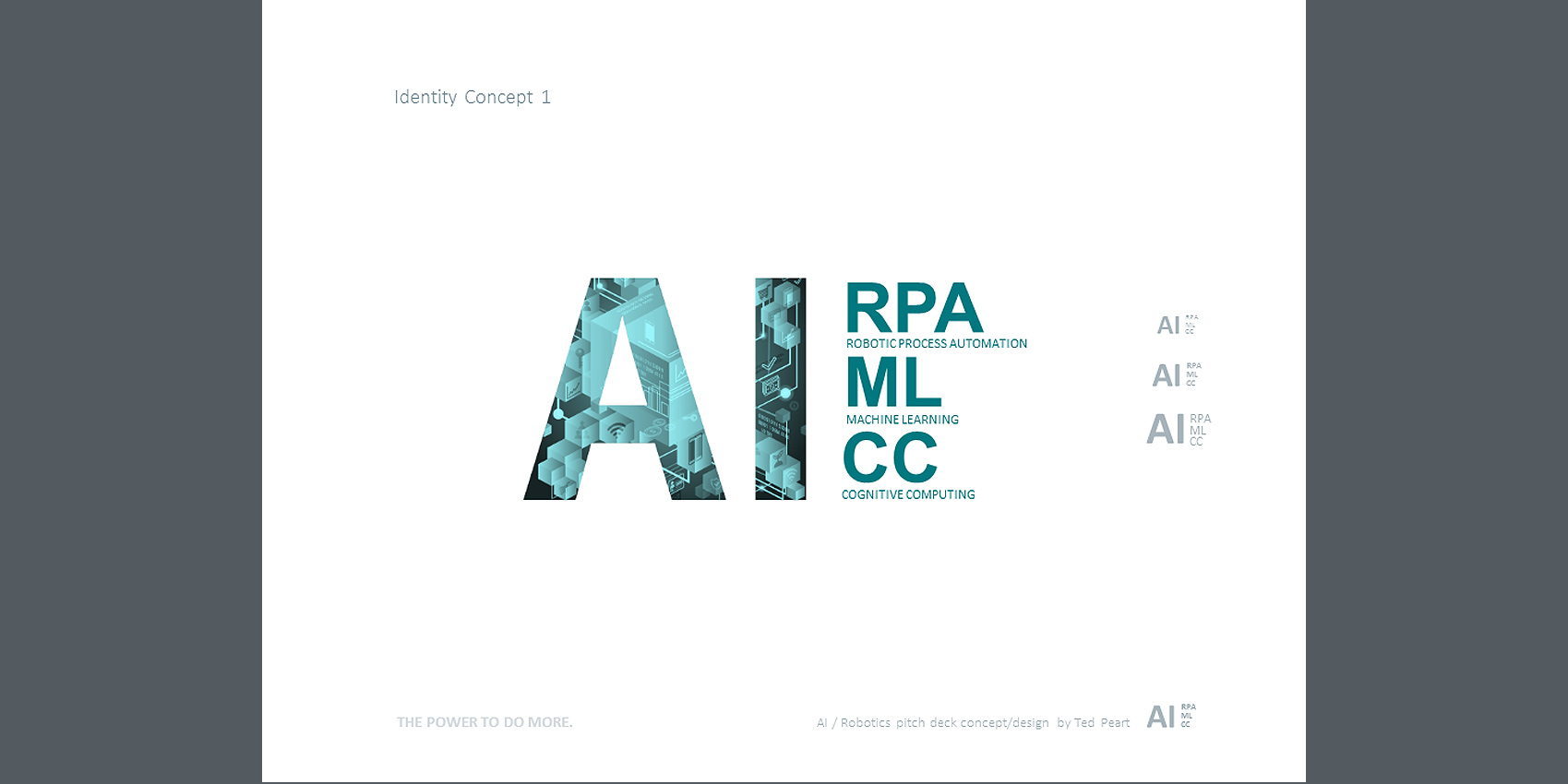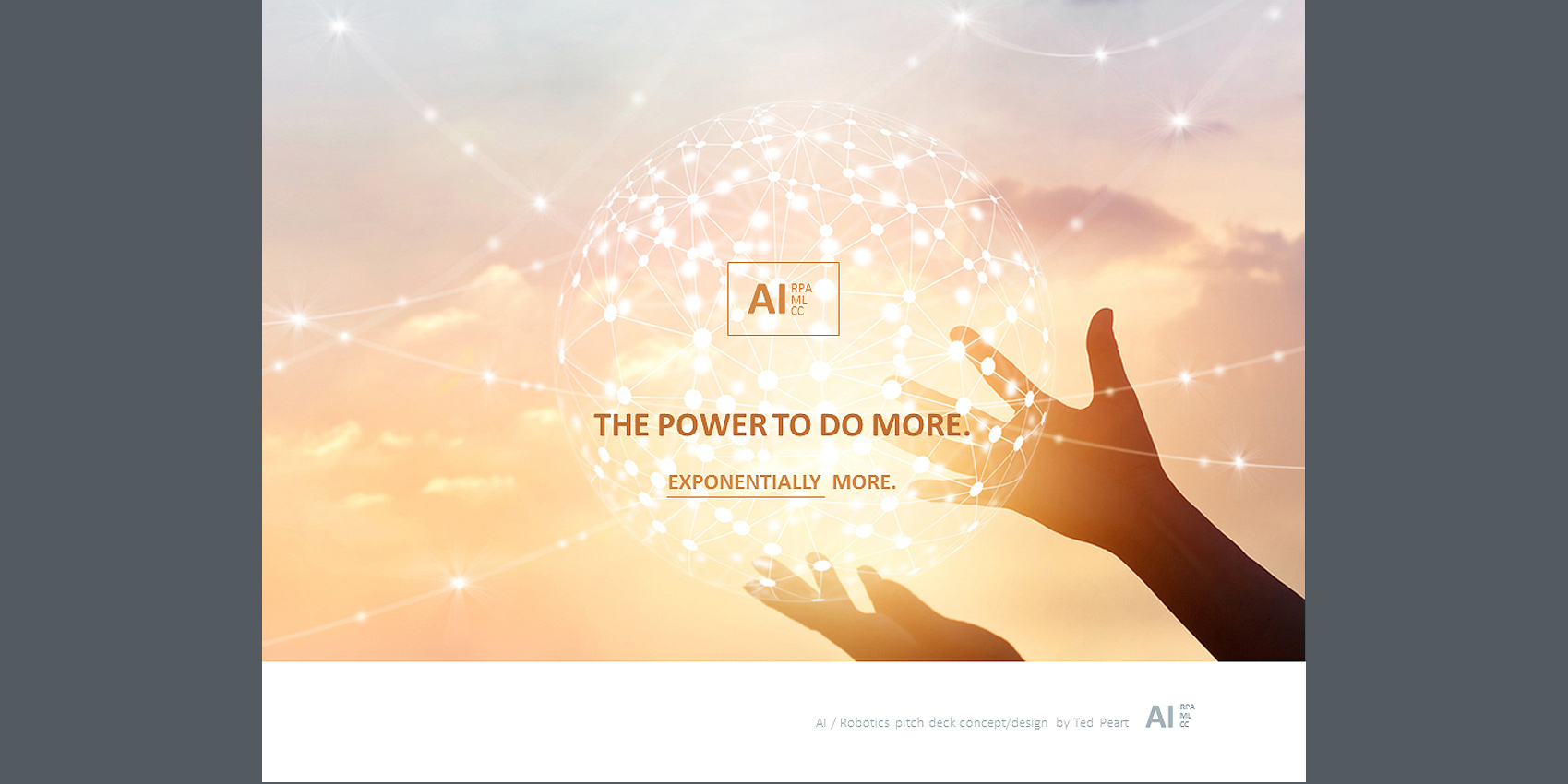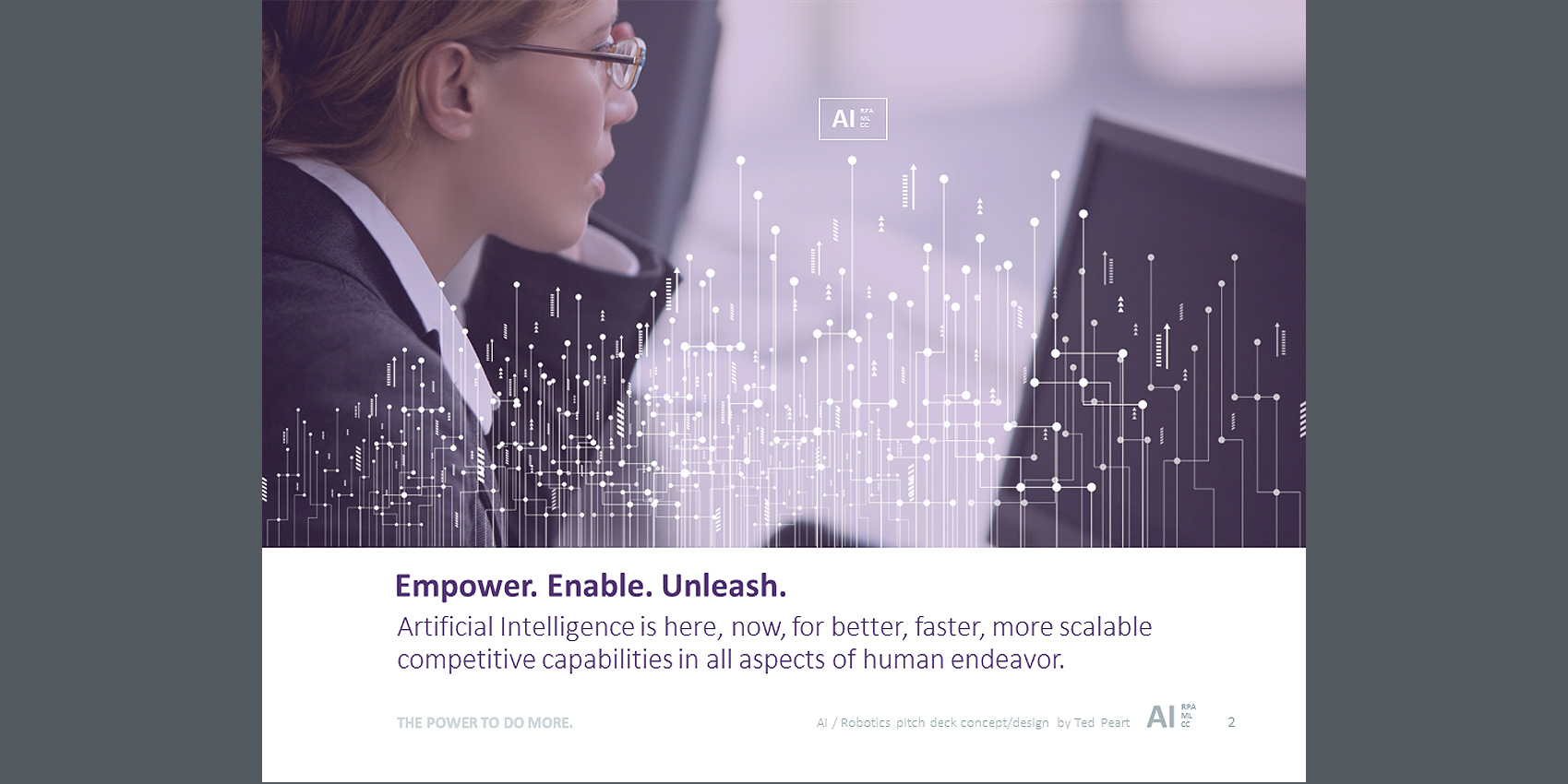 Here's an example of a powerful pitch-deck, designed to promote the adoption of Artificial Intelligence and Machine Automation at Northern Trust. This presentation was targeted to the top executive management team. My assignment was to visually project advanced, dynamic and smarter business operations for the future. Going beyond theme imagery, colors and fonts, a distinctive AI Brand stamp was created to solidify the strategic concepts into a powerful whole that was greater.