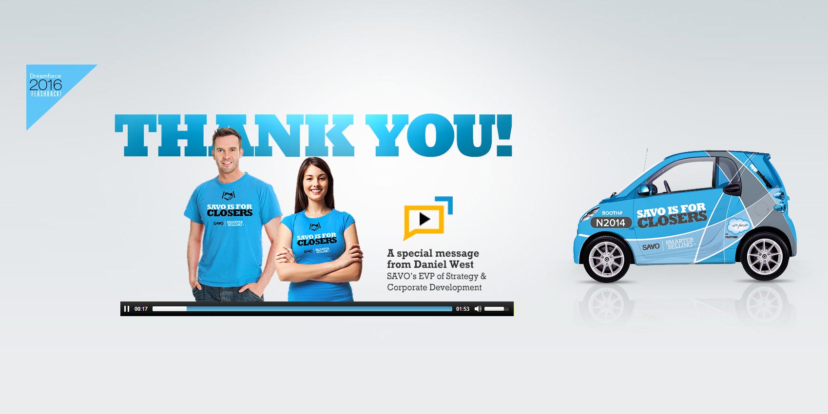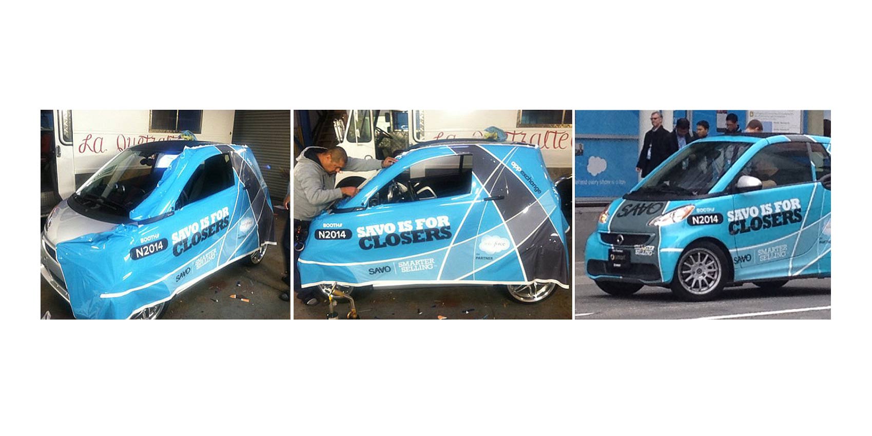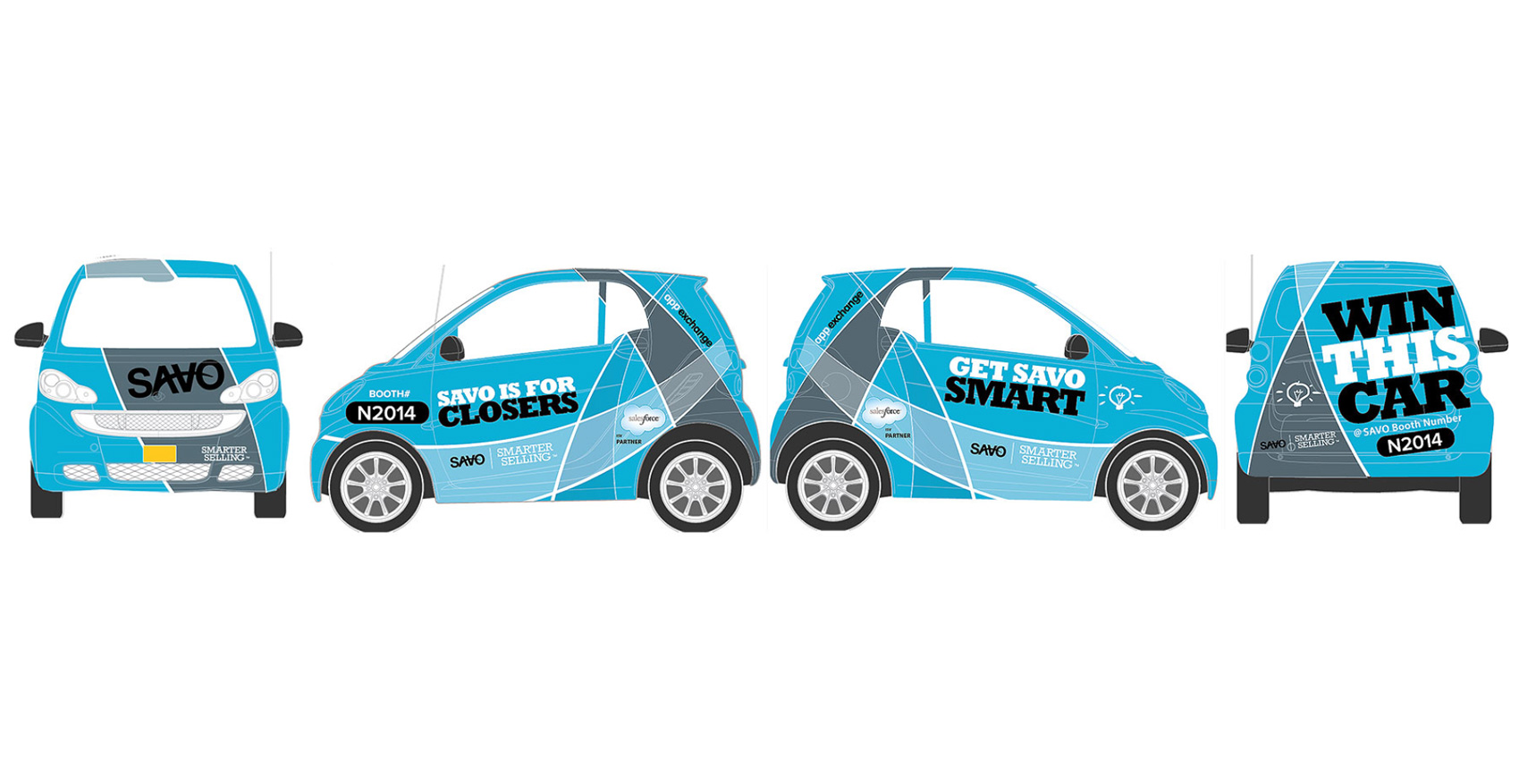 We live in a world filled with graphic designs in almost any direction we look. In this instance, my assignment was to design a graphics wrap with custom branding and messaging for a fleet of Smart Cars at a Salesforce / Dreamforce event in San Francisco. Unfortunately, exhibit space at this show can be prohibitively expensive. So, as a guerilla marketing tactic, my client, SAVO Group, deplayed a small fleet of branded Smart Cars just outside the main entrance to the exhbit hall to gain free curbside publicity and public goodwill by offering free shuttle service to attendees. Prior to and during the event, SAVO offered these Smart Cars as raffle prize incentive for qualified prospects who submitted their contact information.